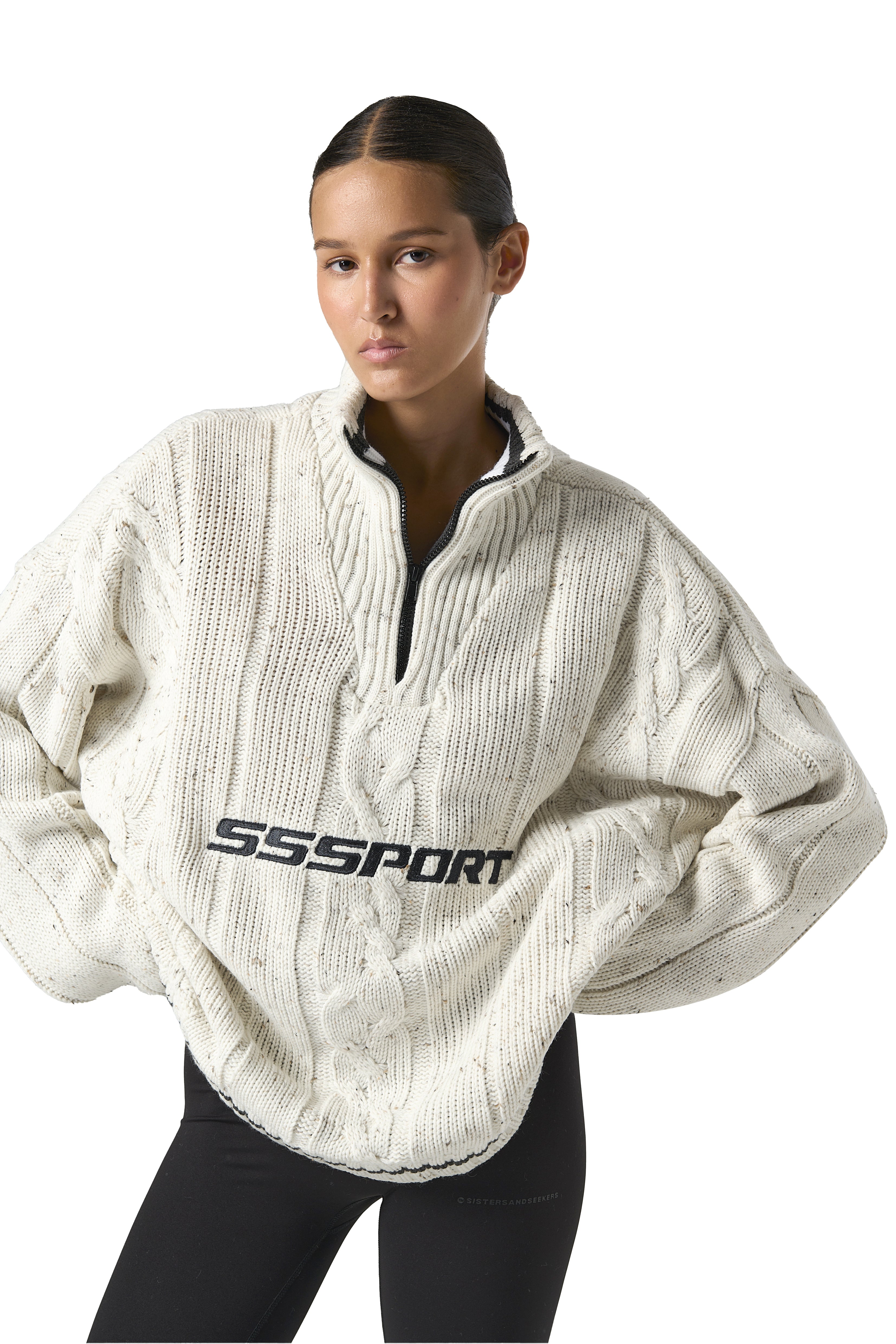 The cosiest sportswear knit. Oversized chunky knit pullover with high neck and zip fastening. Features ‘SSSPORT’ embroidered slogan.