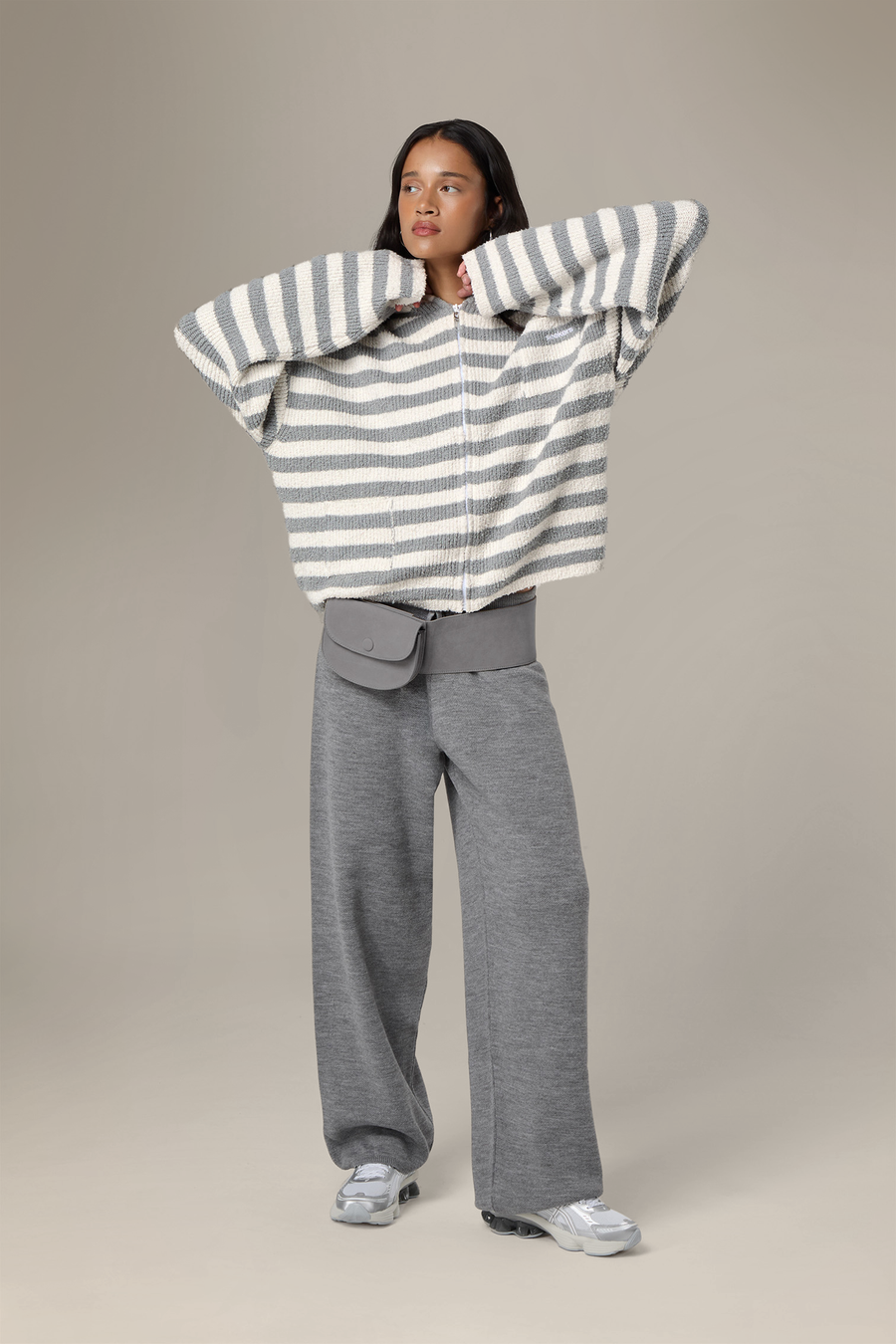 - Oversized zip-up knit hoodie in grey & white stripe