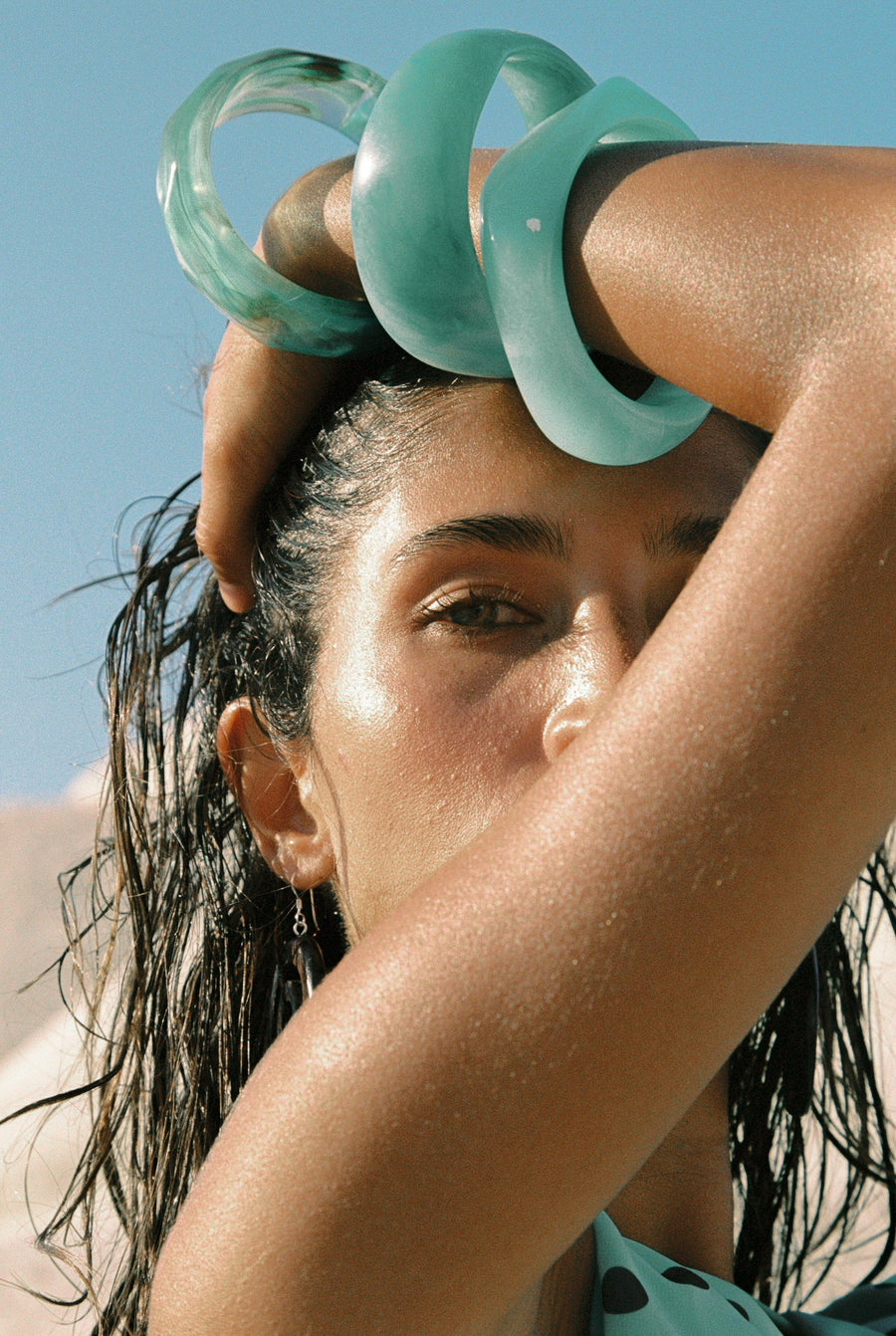 The best things come in threes. Meet the Lagoon Resin Bangles. Crafted in a thick, imperfect slip on design. Stacked in different shades of blue. You like totally need these.