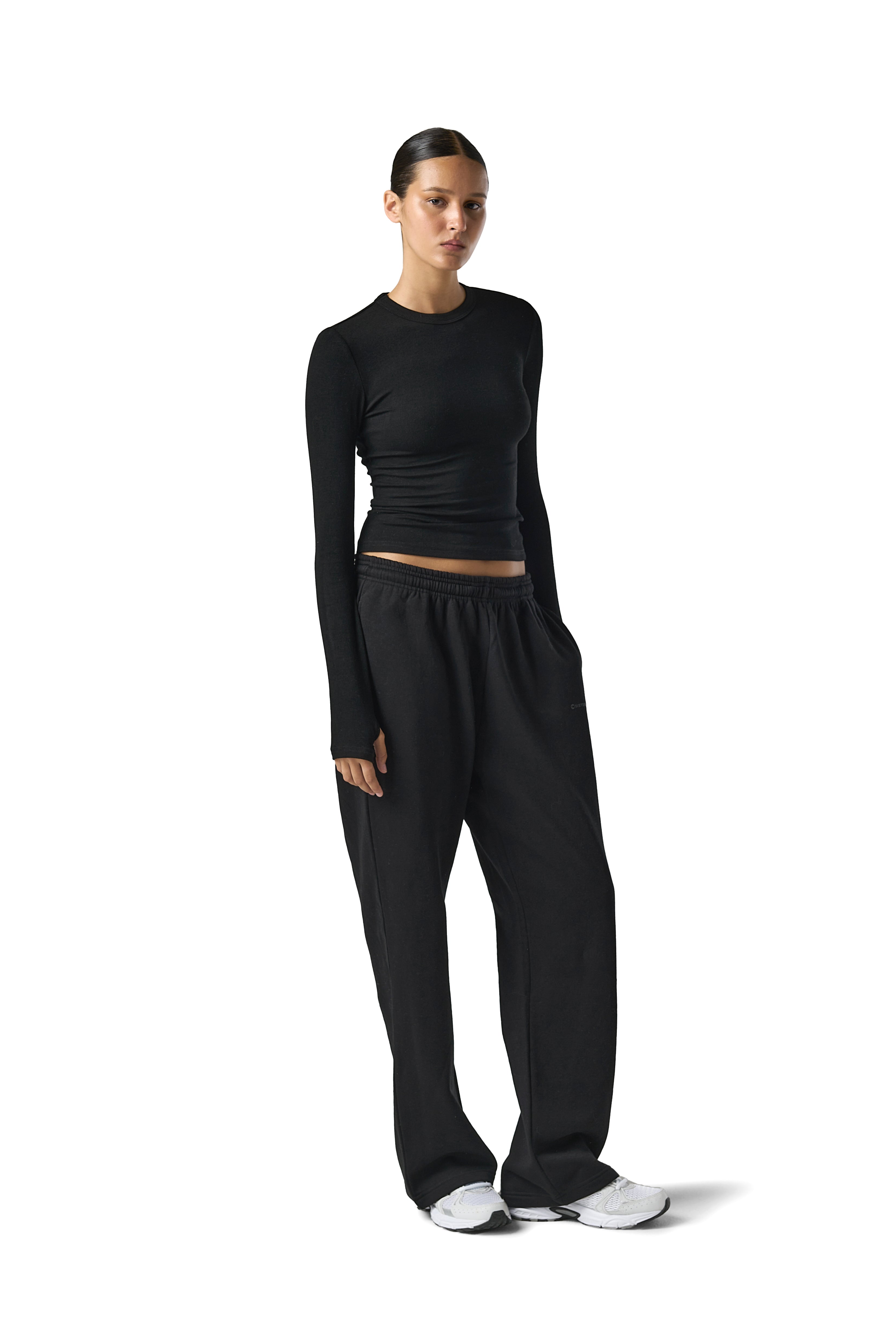 Essentials. Soft, figure hugging long sleeved ribbed top in black. Features thumb hole loop cuffs.