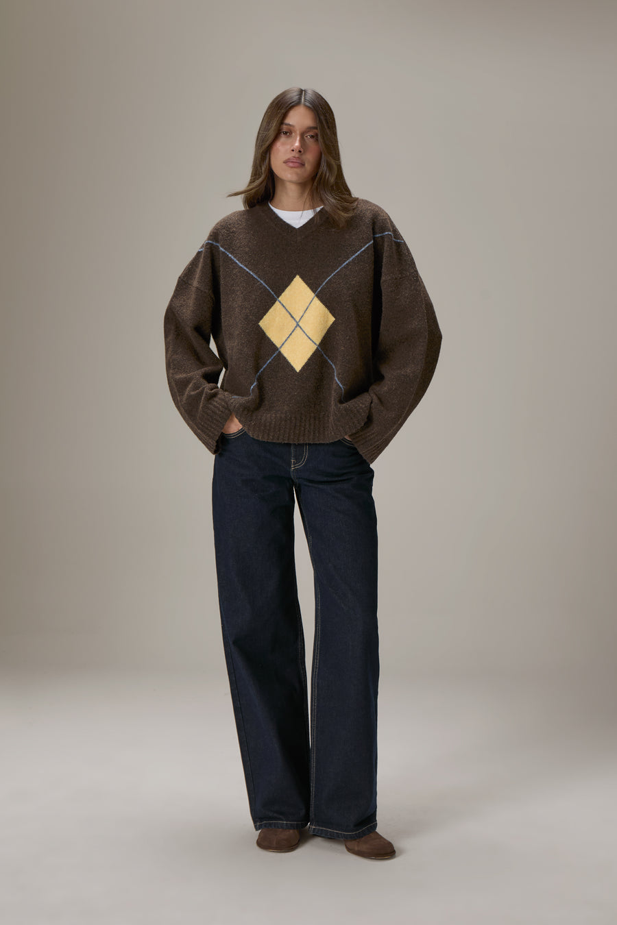 she's a diamond. Meet the Bally Diamond Knit Sweater. Designed in an oversized fit with a high v-neckline and black trim. Features ribbed cuffs and hem with a black trim.