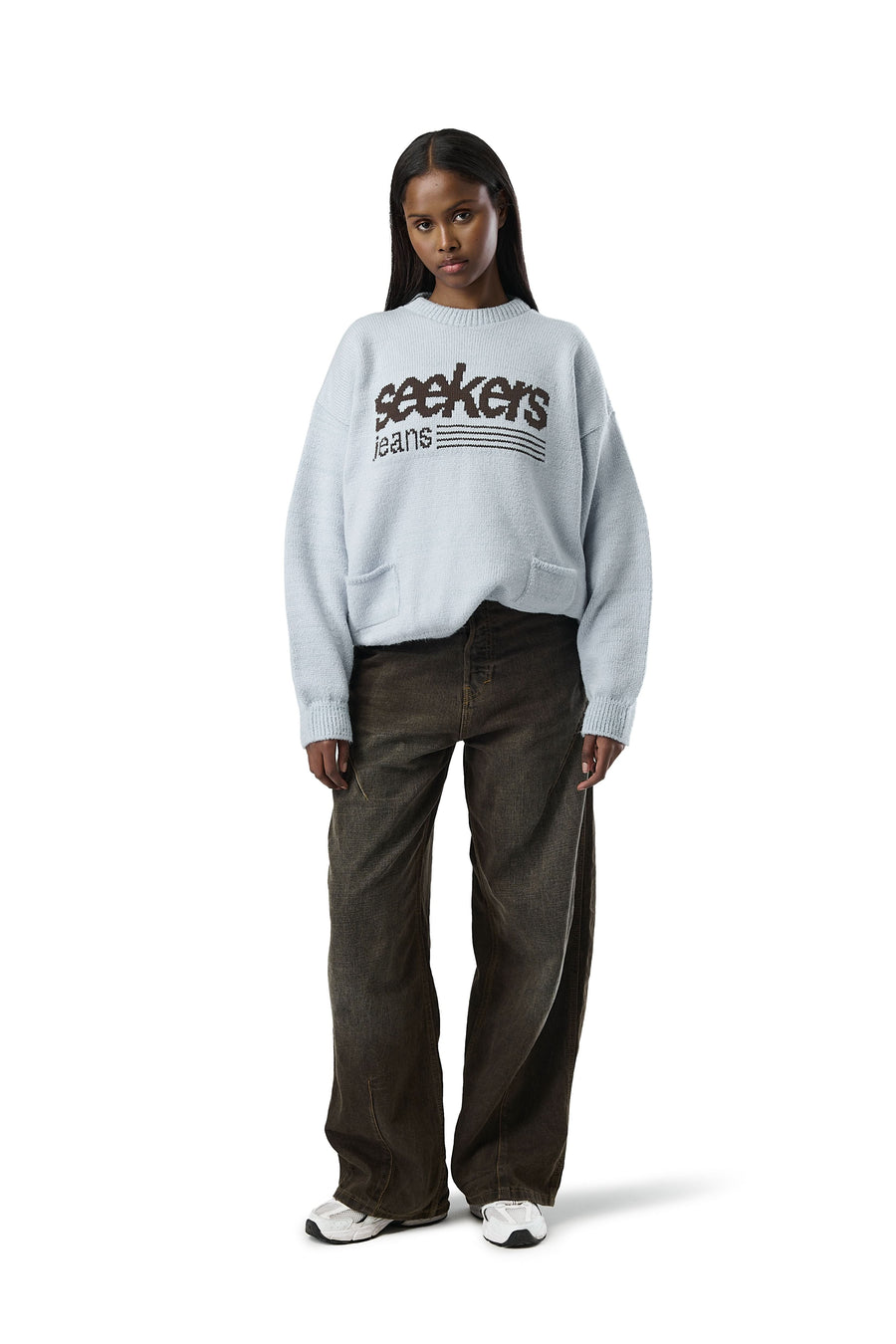 Feeling blue? we’ve got you˚˖𓍢ִ໋🪡.⋆ Introducing our Pandy Knit Sweater, designed from a Seekers favourite. Dropped shoulders and a crew neckline are complemented by our soft oversized knit material, featuring a jacquard 'seekers jeans' logo to the chest and two front pockets.